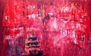 “Sailing in Troubled Waters” is more than just a painting—it is a meditation on the human condition. Dominated by a fiery landscape of crimson and scarlet, the canvas embodies the internal and external storms we all face. The environment is turbulent, textured, and deeply emotional, mirroring the overwhelming pressures of life.