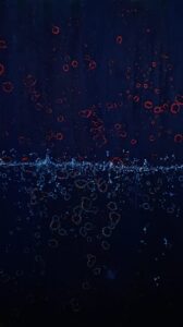 This vertical abstract is a dynamic study in cosmic birth and cellular structure. The canvas is steeped in Midnight Blue and Black, representing the primordial void. A brilliant horizontal seam separates the fiery, pulsing red rings above (chaos/energy) from the cooler, blue and amber rings below (order/formation). This powerful piece explores the instant of creation, drawing parallels between the birth of a universe and the formation of life itself.
